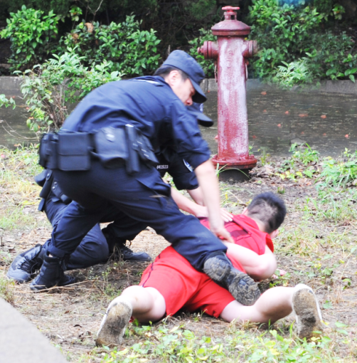 當(dāng)日下午15:30,防恐演練首先開始。演練場景設(shè)置如下:公司大型儲備基地門口兩名保安正在哨位執(zhí)勤,突然,在門前游蕩的1名男子從隨身攜帶的手提袋中抽出管制器械,沖破保安的阻擋竄入廠區(qū)。執(zhí)勤保安一人跟蹤,一人立即啟動(dòng)緊急預(yù)案。基地人員迅速集結(jié)并入廠區(qū)搜索,與此同時(shí),特警緊急響應(yīng),與先期入廠搜索人員一起合力將暴徒圍在中間,用長警棍和防暴鋼叉,將“暴徒”擊倒、制服、上手銬、帶至前來支援的警車內(nèi)。整個(gè)過程干凈利落,用時(shí)不超過2分鐘。